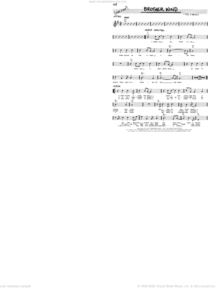 This new feature (still experimental) allows you to ask questions related to this music title to our AI music assistant (powered by OpenAI ChatGPT), trained to answer as an expert on this music title.You may ask questions like "When was this song written?" or "How would you suggest approaching this song?" You can also ask questions about the author or anything else you may think of. Just enter your queries inside the field on the top of the displayed music and click the "Ask" button on the left to start chatting. Remember that the assistant cannot perform catalog searches. It is focused only on this music title. It could also give you wrong or imperfect answers. In that case, click the "regenerate" button on the side of the answer to replace it with a new one. And, of course, you can provide feedback for each answer so we can improve the system. ![]() Timothy O'Brien: Brother Wind for voice and other instruments (real book with lyrics), intermediate voice sheet music. Includes an High-Quality PDF file to download instantly. Licensed to Virtual Sheet Music® by Hal Leonard® publishing company. NOTE: The image above is just a preview of the first page of this item. Buy this item to display, print, and enjoy the complete music. Basic Score Info
