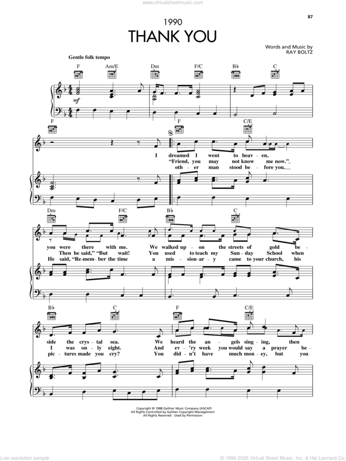 This new feature (still experimental) allows you to ask questions related to this music title to our AI music assistant (powered by OpenAI ChatGPT), trained to answer as an expert on this music title.You may ask questions like "When was this song written?" or "How would you suggest approaching this song?" You can also ask questions about the author or anything else you may think of. Just enter your queries inside the field on the top of the displayed music and click the "Ask" button on the left to start chatting. Remember that the assistant cannot perform catalog searches. It is focused only on this music title. It could also give you wrong or imperfect answers. In that case, click the "regenerate" button on the side of the answer to replace it with a new one. And, of course, you can provide feedback for each answer so we can improve the system. ![]() Ray Boltz: Thank You for voice, piano or guitar, intermediate sheet music. Includes an High-Quality PDF file to download instantly. Licensed to Virtual Sheet Music® by Hal Leonard® publishing company. NOTE: The image above is just a preview of the first page of this item. Buy this item to display, print, and enjoy the complete music. Basic Score Info