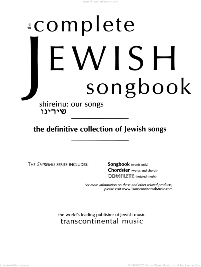 This new feature (still experimental) allows you to ask questions related to this music title to our AI music assistant (powered by OpenAI ChatGPT), trained to answer as an expert on this music title.You may ask questions like "When was this song written?" or "How would you suggest approaching this song?" You can also ask questions about the author or anything else you may think of. Just enter your queries inside the field on the top of the displayed music and click the "Ask" button on the left to start chatting. Remember that the assistant cannot perform catalog searches. It is focused only on this music title. It could also give you wrong or imperfect answers. In that case, click the "regenerate" button on the side of the answer to replace it with a new one. And, of course, you can provide feedback for each answer so we can improve the system. ![]() The Complete Jewish Songbook (The Definitive Collection of Jewish Songs) for voice and other instruments (fake book), intermediate voice sheet music. Includes an High-Quality PDF file to download instantly. Licensed to Virtual Sheet Music® by Hal Leonard® publishing company. NOTE: The image above is just a preview of the first page of this item. Buy this item to display, print, and enjoy the complete music. Basic Score Info