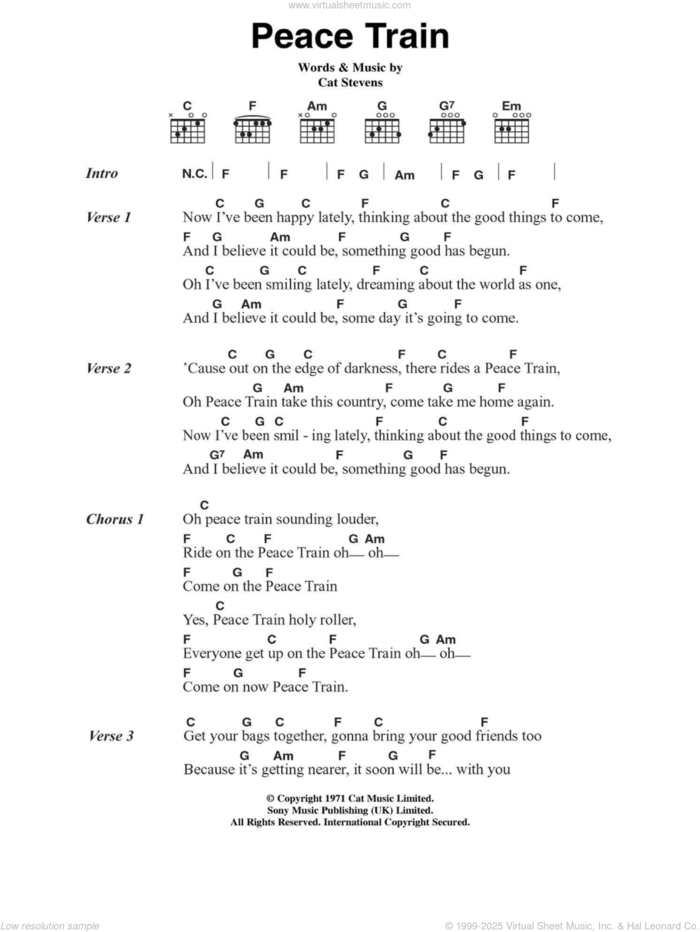 This new feature (still experimental) allows you to ask questions related to this music title to our AI music assistant (powered by OpenAI ChatGPT), trained to answer as an expert on this music title.You may ask questions like "When was this song written?" or "How would you suggest approaching this song?" You can also ask questions about the author or anything else you may think of. Just enter your queries inside the field on the top of the displayed music and click the "Ask" button on the left to start chatting. Remember that the assistant cannot perform catalog searches. It is focused only on this music title. It could also give you wrong or imperfect answers. In that case, click the "regenerate" button on the side of the answer to replace it with a new one. And, of course, you can provide feedback for each answer so we can improve the system. ![]() Cat Stevens: Peace Train for guitar (chords), intermediate sheet music. Includes an High-Quality PDF file to download instantly. Licensed to Virtual Sheet Music® by Hal Leonard® publishing company. NOTE: The image above is just a preview of the first page of this item. Buy this item to display, print, and enjoy the complete music. Basic Score Info