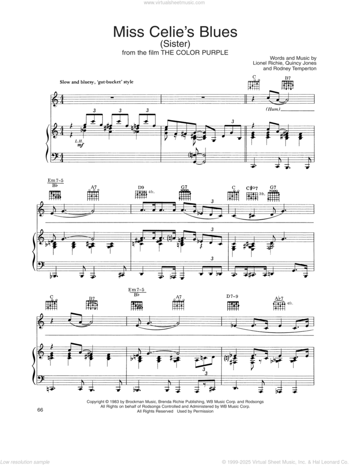 This new feature (still experimental) allows you to ask questions related to this music title to our AI music assistant (powered by OpenAI ChatGPT), trained to answer as an expert on this music title.You may ask questions like "When was this song written?" or "How would you suggest approaching this song?" You can also ask questions about the author or anything else you may think of. Just enter your queries inside the field on the top of the displayed music and click the "Ask" button on the left to start chatting. Remember that the assistant cannot perform catalog searches. It is focused only on this music title. It could also give you wrong or imperfect answers. In that case, click the "regenerate" button on the side of the answer to replace it with a new one. And, of course, you can provide feedback for each answer so we can improve the system. ![]() Táta Vega: Miss Celie's Blues (Sister) (from The Color Purple) for voice, piano or guitar, intermediate sheet music. Includes an High-Quality PDF file to download instantly. Licensed to Virtual Sheet Music® by Hal Leonard® publishing company. NOTE: The image above is just a preview of the first page of this item. Buy this item to display, print, and enjoy the complete music. Basic Score Info