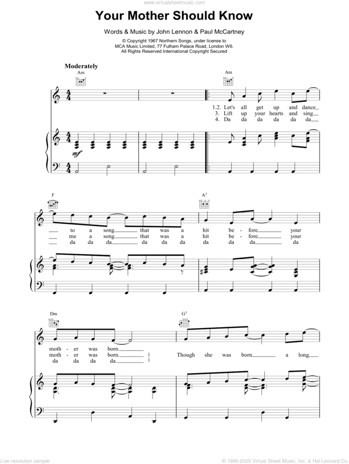 This new feature (still experimental) allows you to ask questions related to this music title to our AI music assistant (powered by OpenAI ChatGPT), trained to answer as an expert on this music title.You may ask questions like "When was this song written?" or "How would you suggest approaching this song?" You can also ask questions about the author or anything else you may think of. Just enter your queries inside the field on the top of the displayed music and click the "Ask" button on the left to start chatting. Remember that the assistant cannot perform catalog searches. It is focused only on this music title. It could also give you wrong or imperfect answers. In that case, click the "regenerate" button on the side of the answer to replace it with a new one. And, of course, you can provide feedback for each answer so we can improve the system. ![]() The Beatles: Your Mother Should Know for voice, piano or guitar, intermediate sheet music. Includes an High-Quality PDF file to download instantly. Licensed to Virtual Sheet Music® by Hal Leonard® publishing company. NOTE: The image above is just a preview of the first page of this item. Buy this item to display, print, and enjoy the complete music. Basic Score Info