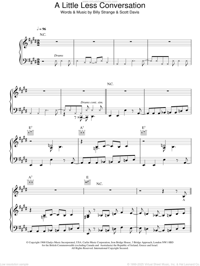 This new feature (still experimental) allows you to ask questions related to this music title to our AI music assistant (powered by OpenAI ChatGPT), trained to answer as an expert on this music title.You may ask questions like "When was this song written?" or "How would you suggest approaching this song?" You can also ask questions about the author or anything else you may think of. Just enter your queries inside the field on the top of the displayed music and click the "Ask" button on the left to start chatting. Remember that the assistant cannot perform catalog searches. It is focused only on this music title. It could also give you wrong or imperfect answers. In that case, click the "regenerate" button on the side of the answer to replace it with a new one. And, of course, you can provide feedback for each answer so we can improve the system. ![]() Elvis Presley: A Little Less Conversation for voice, piano or guitar, intermediate sheet music. Includes an High-Quality PDF file to download instantly. Licensed to Virtual Sheet Music® by Hal Leonard® publishing company. NOTE: The image above is just a preview of the first page of this item. Buy this item to display, print, and enjoy the complete music. Basic Score Info