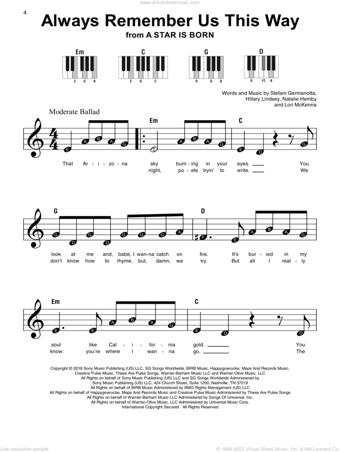 This new feature (still experimental) allows you to ask questions related to this music title to our AI music assistant (powered by OpenAI ChatGPT), trained to answer as an expert on this music title.You may ask questions like "When was this song written?" or "How would you suggest approaching this song?" You can also ask questions about the author or anything else you may think of. Just enter your queries inside the field on the top of the displayed music and click the "Ask" button on the left to start chatting. Remember that the assistant cannot perform catalog searches. It is focused only on this music title. It could also give you wrong or imperfect answers. In that case, click the "regenerate" button on the side of the answer to replace it with a new one. And, of course, you can provide feedback for each answer so we can improve the system. ![]() Lady Gaga: Always Remember Us This Way (from A Star Is Born), (beginner) for piano solo, beginner piano sheet music. Includes an High-Quality PDF file to download instantly. Licensed to Virtual Sheet Music® by Hal Leonard® publishing company. NOTE: The image above is just a preview of the first page of this item. Buy this item to display, print, and enjoy the complete music. Basic Score Info