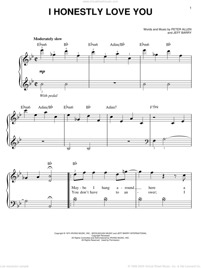 This new feature (still experimental) allows you to ask questions related to this music title to our AI music assistant (powered by OpenAI ChatGPT), trained to answer as an expert on this music title.You may ask questions like "When was this song written?" or "How would you suggest approaching this song?" You can also ask questions about the author or anything else you may think of. Just enter your queries inside the field on the top of the displayed music and click the "Ask" button on the left to start chatting. Remember that the assistant cannot perform catalog searches. It is focused only on this music title. It could also give you wrong or imperfect answers. In that case, click the "regenerate" button on the side of the answer to replace it with a new one. And, of course, you can provide feedback for each answer so we can improve the system. ![]() Olivia Newton-John: I Honestly Love You (from The Boy From Oz) for piano solo, easy piano sheet music. High-Quality and Interactive, transposable in any key, play along. Includes an High-Quality PDF file to download instantly. Licensed to Virtual Sheet Music® by Hal Leonard® publishing company. NOTE: The sample above is just the first page preview of this item. Buy this item to display, print, and play the complete music. Basic Score Info