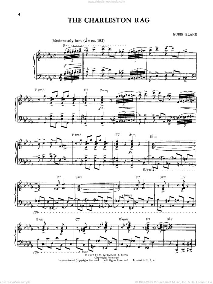 This new feature (still experimental) allows you to ask questions related to this music title to our AI music assistant (powered by OpenAI ChatGPT), trained to answer as an expert on this music title.You may ask questions like "When was this song written?" or "How would you suggest approaching this song?" You can also ask questions about the author or anything else you may think of. Just enter your queries inside the field on the top of the displayed music and click the "Ask" button on the left to start chatting. Remember that the assistant cannot perform catalog searches. It is focused only on this music title. It could also give you wrong or imperfect answers. In that case, click the "regenerate" button on the side of the answer to replace it with a new one. And, of course, you can provide feedback for each answer so we can improve the system. ![]() Eubie Blake: The Charleston Rag for piano solo, intermediate piano sheet music. Includes an High-Quality PDF file to download instantly. Licensed to Virtual Sheet Music® by Hal Leonard® publishing company. NOTE: The image above is just a preview of the first page of this item. Buy this item to display, print, and enjoy the complete music. Basic Score Info