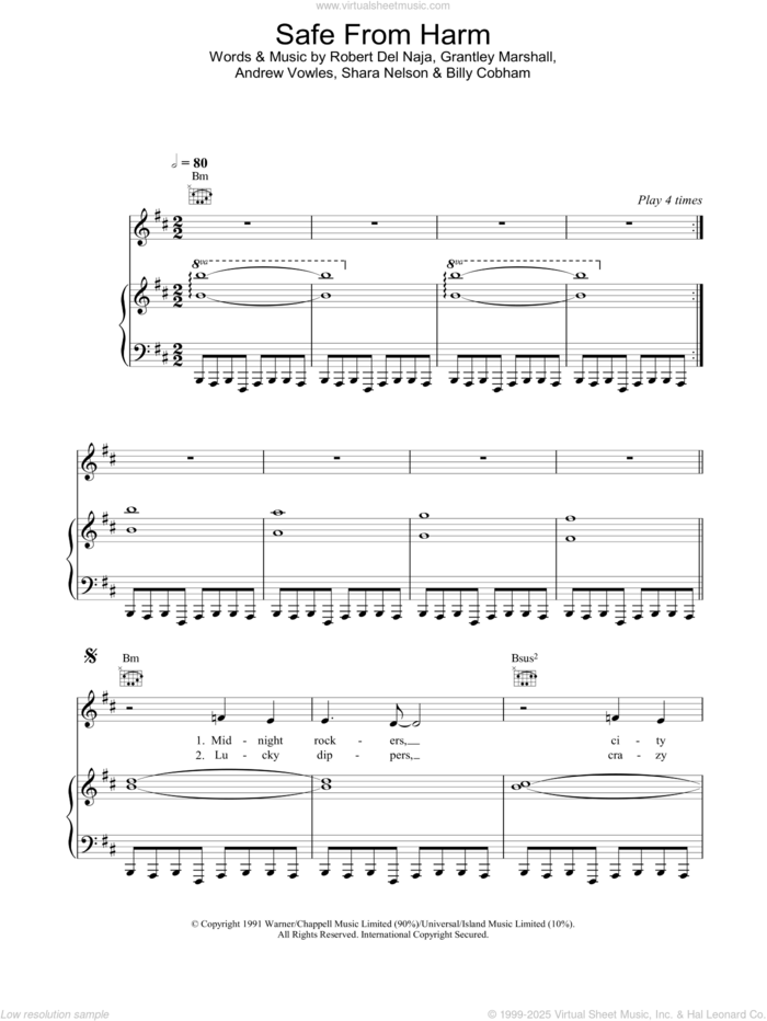 This new feature (still experimental) allows you to ask questions related to this music title to our AI music assistant (powered by OpenAI ChatGPT), trained to answer as an expert on this music title.You may ask questions like "When was this song written?" or "How would you suggest approaching this song?" You can also ask questions about the author or anything else you may think of. Just enter your queries inside the field on the top of the displayed music and click the "Ask" button on the left to start chatting. Remember that the assistant cannot perform catalog searches. It is focused only on this music title. It could also give you wrong or imperfect answers. In that case, click the "regenerate" button on the side of the answer to replace it with a new one. And, of course, you can provide feedback for each answer so we can improve the system. ![]() Massive Attack: Safe From Harm for voice, piano or guitar, intermediate sheet music. Includes an High-Quality PDF file to download instantly. Licensed to Virtual Sheet Music® by Hal Leonard® publishing company. NOTE: The image above is just a preview of the first page of this item. Buy this item to display, print, and enjoy the complete music. Basic Score Info
