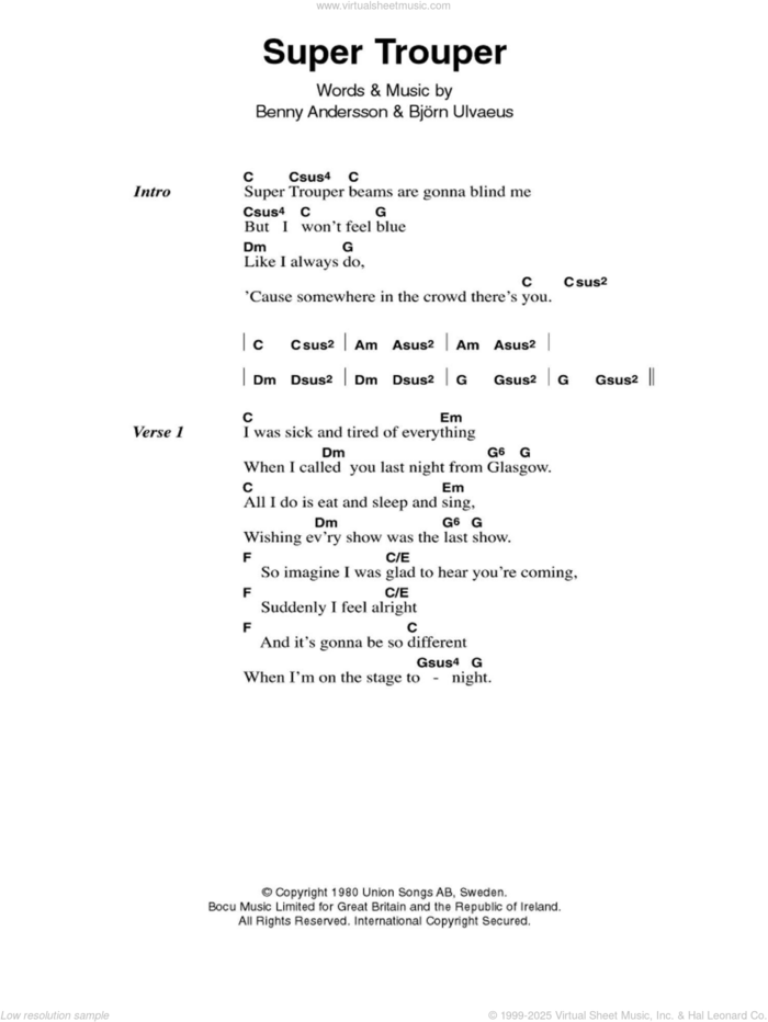 This new feature (still experimental) allows you to ask questions related to this music title to our AI music assistant (powered by OpenAI ChatGPT), trained to answer as an expert on this music title.You may ask questions like "When was this song written?" or "How would you suggest approaching this song?" You can also ask questions about the author or anything else you may think of. Just enter your queries inside the field on the top of the displayed music and click the "Ask" button on the left to start chatting. Remember that the assistant cannot perform catalog searches. It is focused only on this music title. It could also give you wrong or imperfect answers. In that case, click the "regenerate" button on the side of the answer to replace it with a new one. And, of course, you can provide feedback for each answer so we can improve the system. ![]() ABBA: Super Trouper for guitar (chords), intermediate sheet music. Includes an High-Quality PDF file to download instantly. Licensed to Virtual Sheet Music® by Hal Leonard® publishing company. NOTE: The image above is just a preview of the first page of this item. Buy this item to display, print, and enjoy the complete music. Basic Score Info