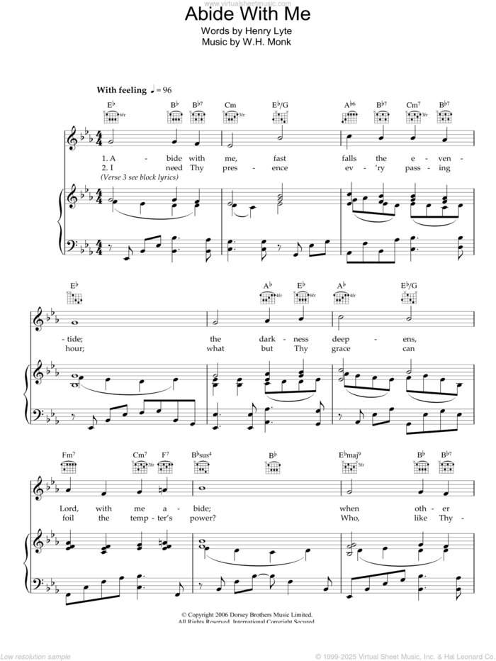This new feature (still experimental) allows you to ask questions related to this music title to our AI music assistant (powered by OpenAI ChatGPT), trained to answer as an expert on this music title.You may ask questions like "When was this song written?" or "How would you suggest approaching this song?" You can also ask questions about the author or anything else you may think of. Just enter your queries inside the field on the top of the displayed music and click the "Ask" button on the left to start chatting. Remember that the assistant cannot perform catalog searches. It is focused only on this music title. It could also give you wrong or imperfect answers. In that case, click the "regenerate" button on the side of the answer to replace it with a new one. And, of course, you can provide feedback for each answer so we can improve the system. ![]() Henry F. Lyte: Abide With Me for voice, piano or guitar, intermediate sheet music. Includes an High-Quality PDF file to download instantly. Licensed to Virtual Sheet Music® by Hal Leonard® publishing company. NOTE: The image above is just a preview of the first page of this item. Buy this item to display, print, and enjoy the complete music. Basic Score Info