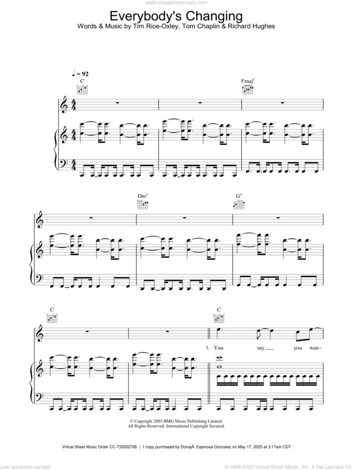This new feature (still experimental) allows you to ask questions related to this music title to our AI music assistant (powered by OpenAI ChatGPT), trained to answer as an expert on this music title.You may ask questions like "When was this song written?" or "How would you suggest approaching this song?" You can also ask questions about the author or anything else you may think of. Just enter your queries inside the field on the top of the displayed music and click the "Ask" button on the left to start chatting. Remember that the assistant cannot perform catalog searches. It is focused only on this music title. It could also give you wrong or imperfect answers. In that case, click the "regenerate" button on the side of the answer to replace it with a new one. And, of course, you can provide feedback for each answer so we can improve the system. ![]() Tim Rice-Oxley: Everybody's Changing for voice, piano or guitar, intermediate sheet music. High-Quality and Interactive, transposable in any key, play along. Includes an High-Quality PDF file to download instantly. Licensed to Virtual Sheet Music® by Hal Leonard® publishing company. NOTE: The sample above is just the first page preview of this item. Buy this item to display, print, and play the complete music. Basic Score Info