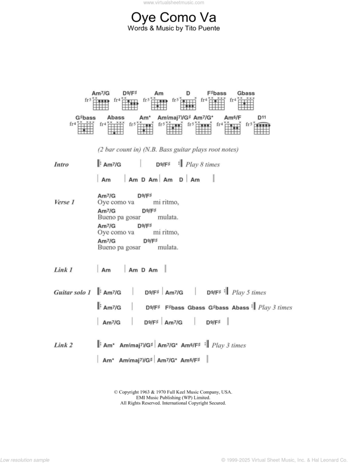 This new feature (still experimental) allows you to ask questions related to this music title to our AI music assistant (powered by OpenAI ChatGPT), trained to answer as an expert on this music title.You may ask questions like "When was this song written?" or "How would you suggest approaching this song?" You can also ask questions about the author or anything else you may think of. Just enter your queries inside the field on the top of the displayed music and click the "Ask" button on the left to start chatting. Remember that the assistant cannot perform catalog searches. It is focused only on this music title. It could also give you wrong or imperfect answers. In that case, click the "regenerate" button on the side of the answer to replace it with a new one. And, of course, you can provide feedback for each answer so we can improve the system. ![]() Tito Puente: Oye Como Va for guitar (chords), intermediate sheet music. Includes an High-Quality PDF file to download instantly. Licensed to Virtual Sheet Music® by Hal Leonard® publishing company. NOTE: The image above is just a preview of the first page of this item. Buy this item to display, print, and enjoy the complete music. Basic Score Info