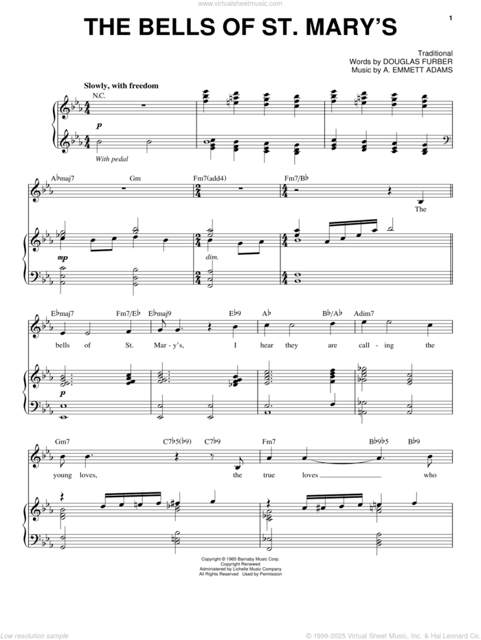 This new feature (still experimental) allows you to ask questions related to this music title to our AI music assistant (powered by OpenAI ChatGPT), trained to answer as an expert on this music title.You may ask questions like "When was this song written?" or "How would you suggest approaching this song?" You can also ask questions about the author or anything else you may think of. Just enter your queries inside the field on the top of the displayed music and click the "Ask" button on the left to start chatting. Remember that the assistant cannot perform catalog searches. It is focused only on this music title. It could also give you wrong or imperfect answers. In that case, click the "regenerate" button on the side of the answer to replace it with a new one. And, of course, you can provide feedback for each answer so we can improve the system. ![]() Andy Williams: The Bells Of St. Mary's for voice and piano, intermediate voice sheet music. Includes an High-Quality PDF file to download instantly. Licensed to Virtual Sheet Music® by Hal Leonard® publishing company. NOTE: The image above is just a preview of the first page of this item. Buy this item to display, print, and enjoy the complete music. Basic Score Info