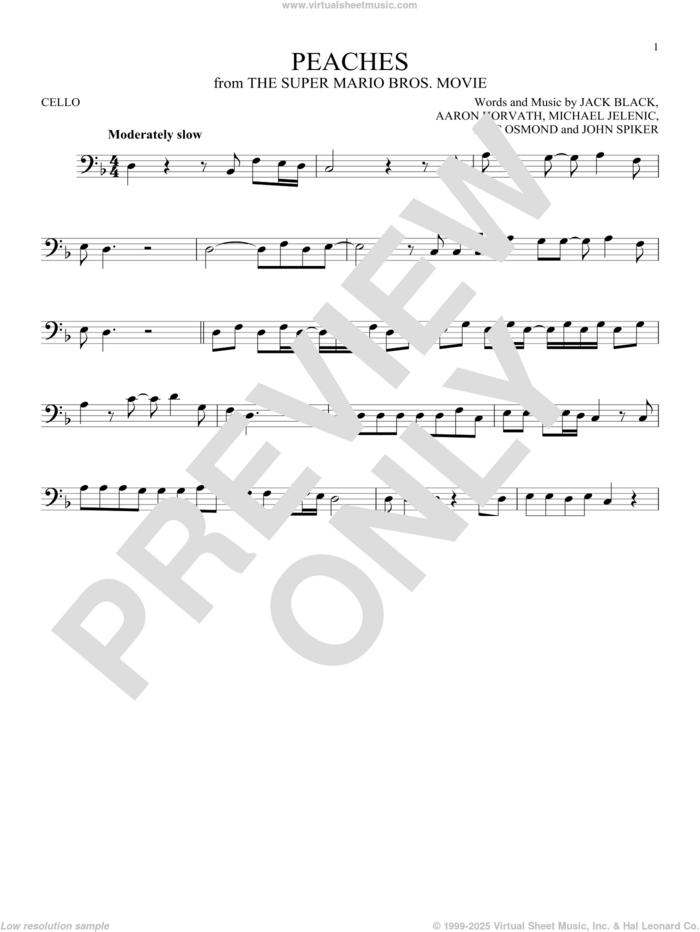This new feature (still experimental) allows you to ask questions related to this music title to our AI music assistant (powered by OpenAI ChatGPT), trained to answer as an expert on this music title.You may ask questions like "When was this song written?" or "How would you suggest approaching this song?" You can also ask questions about the author or anything else you may think of. Just enter your queries inside the field on the top of the displayed music and click the "Ask" button on the left to start chatting. Remember that the assistant cannot perform catalog searches. It is focused only on this music title. It could also give you wrong or imperfect answers. In that case, click the "regenerate" button on the side of the answer to replace it with a new one. And, of course, you can provide feedback for each answer so we can improve the system. ![]() Jack Black: Peaches (from The Super Mario Bros. Movie) for cello solo, intermediate cello sheet music. High-Quality and Interactive, transposable in any key, play along. Includes an High-Quality PDF file to download instantly. Licensed to Virtual Sheet Music® by Hal Leonard® publishing company. NOTE: The sample above is just the first page preview of this item. Buy this item to display, print, and play the complete music. Basic Score Info