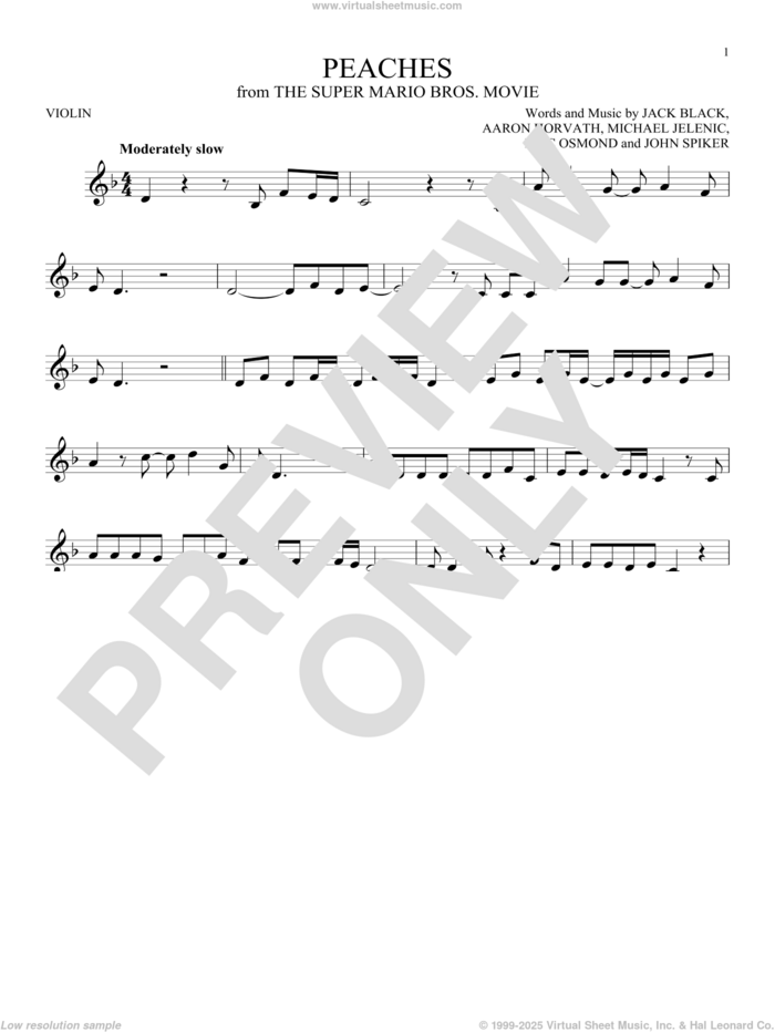 This new feature (still experimental) allows you to ask questions related to this music title to our AI music assistant (powered by OpenAI ChatGPT), trained to answer as an expert on this music title.You may ask questions like "When was this song written?" or "How would you suggest approaching this song?" You can also ask questions about the author or anything else you may think of. Just enter your queries inside the field on the top of the displayed music and click the "Ask" button on the left to start chatting. Remember that the assistant cannot perform catalog searches. It is focused only on this music title. It could also give you wrong or imperfect answers. In that case, click the "regenerate" button on the side of the answer to replace it with a new one. And, of course, you can provide feedback for each answer so we can improve the system. ![]() Jack Black: Peaches (from The Super Mario Bros. Movie) for violin solo, intermediate violin sheet music. High-Quality and Interactive, transposable in any key, play along. Includes an High-Quality PDF file to download instantly. Licensed to Virtual Sheet Music® by Hal Leonard® publishing company. NOTE: The sample above is just the first page preview of this item. Buy this item to display, print, and play the complete music. Basic Score Info