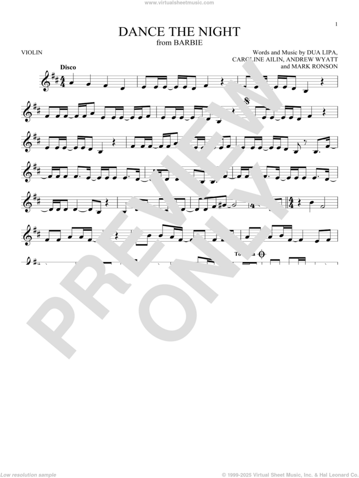 This new feature (still experimental) allows you to ask questions related to this music title to our AI music assistant (powered by OpenAI ChatGPT), trained to answer as an expert on this music title.You may ask questions like "When was this song written?" or "How would you suggest approaching this song?" You can also ask questions about the author or anything else you may think of. Just enter your queries inside the field on the top of the displayed music and click the "Ask" button on the left to start chatting. Remember that the assistant cannot perform catalog searches. It is focused only on this music title. It could also give you wrong or imperfect answers. In that case, click the "regenerate" button on the side of the answer to replace it with a new one. And, of course, you can provide feedback for each answer so we can improve the system. ![]() Dua Lipa: Dance The Night (from Barbie) for violin solo, intermediate violin sheet music. High-Quality and Interactive, transposable in any key, play along. Includes an High-Quality PDF file to download instantly. Licensed to Virtual Sheet Music® by Hal Leonard® publishing company. NOTE: The sample above is just the first page preview of this item. Buy this item to display, print, and play the complete music. Basic Score Info