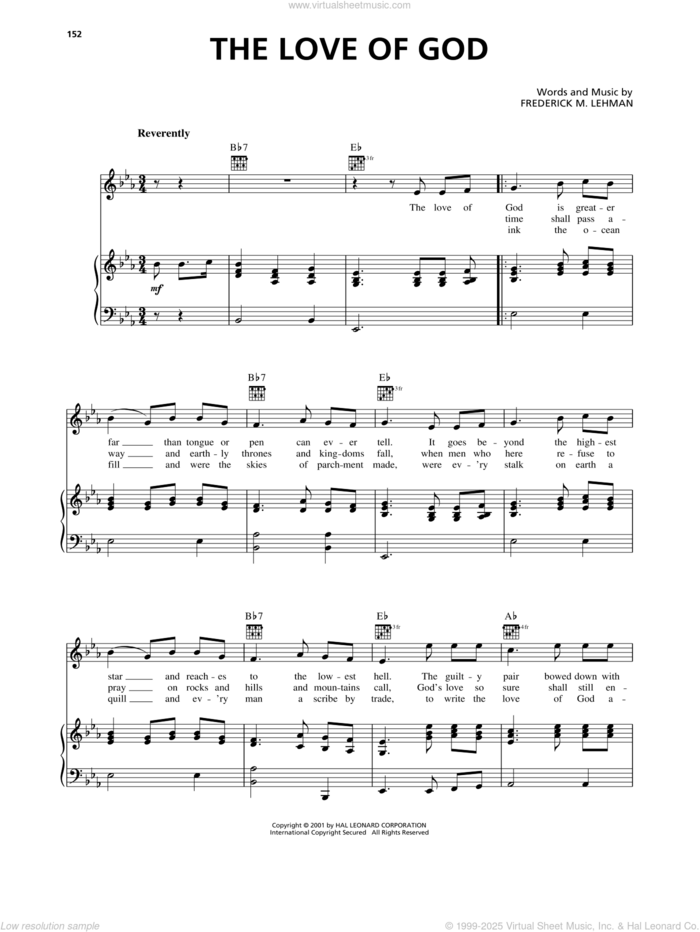 This new feature (still experimental) allows you to ask questions related to this music title to our AI music assistant (powered by OpenAI ChatGPT), trained to answer as an expert on this music title.You may ask questions like "When was this song written?" or "How would you suggest approaching this song?" You can also ask questions about the author or anything else you may think of. Just enter your queries inside the field on the top of the displayed music and click the "Ask" button on the left to start chatting. Remember that the assistant cannot perform catalog searches. It is focused only on this music title. It could also give you wrong or imperfect answers. In that case, click the "regenerate" button on the side of the answer to replace it with a new one. And, of course, you can provide feedback for each answer so we can improve the system. ![]() Frederick M. Lehman: The Love Of God for voice, piano or guitar, intermediate sheet music. Includes an High-Quality PDF file to download instantly. Licensed to Virtual Sheet Music® by Hal Leonard® publishing company. NOTE: The image above is just a preview of the first page of this item. Buy this item to display, print, and enjoy the complete music. Basic Score Info
