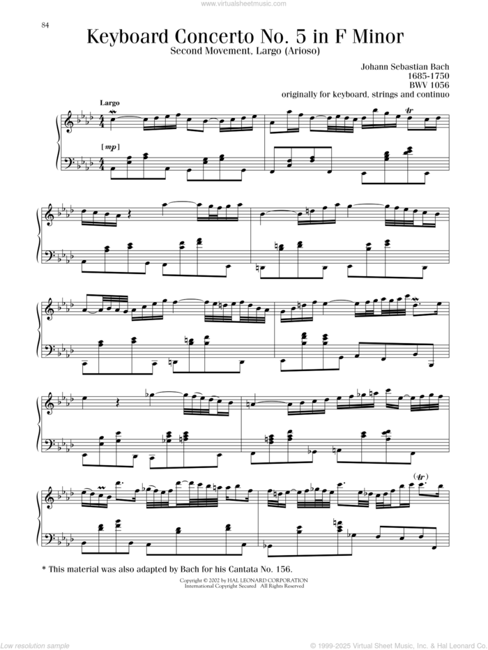 Virtual Sheet Music® Premium High-Quality digital sheet music for piano (or harpsichord), bWV 1056, from Piano Concerto No. 5 in F minor, originally for harpsichord, strings and continuo. This music has been professionally edited.