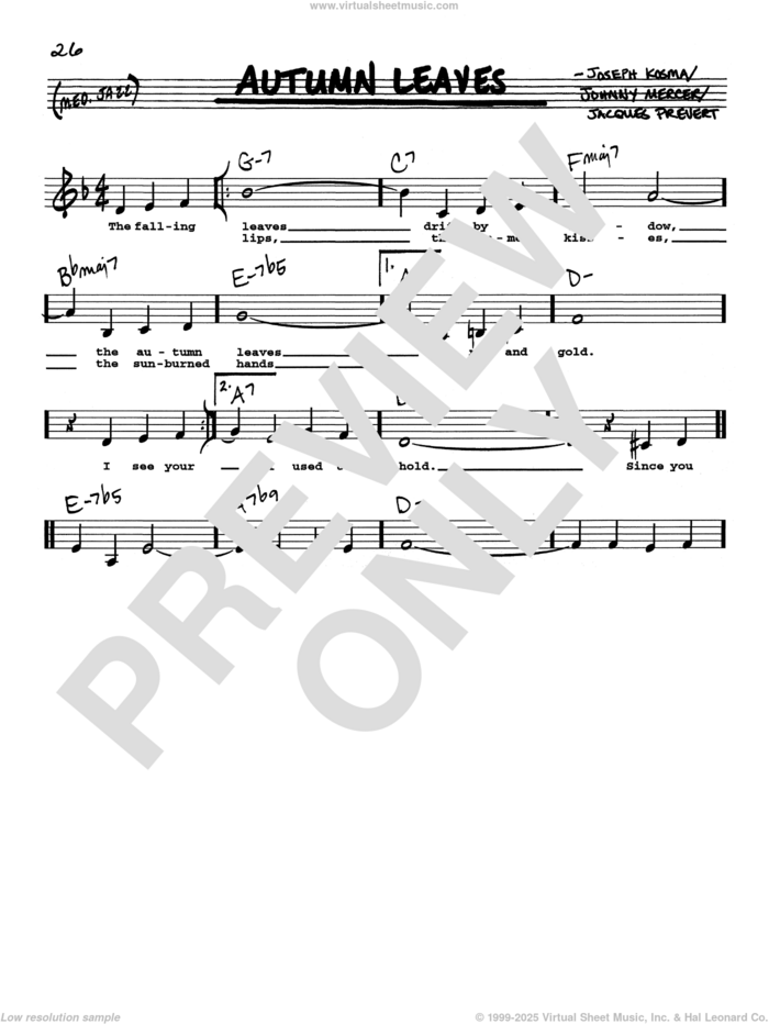 This new feature (still experimental) allows you to ask questions related to this music title to our AI music assistant (powered by OpenAI ChatGPT), trained to answer as an expert on this music title.You may ask questions like "When was this song written?" or "How would you suggest approaching this song?" You can also ask questions about the author or anything else you may think of. Just enter your queries inside the field on the top of the displayed music and click the "Ask" button on the left to start chatting. Remember that the assistant cannot perform catalog searches. It is focused only on this music title. It could also give you wrong or imperfect answers. In that case, click the "regenerate" button on the side of the answer to replace it with a new one. And, of course, you can provide feedback for each answer so we can improve the system. ![]() Johnny Mercer: Autumn Leaves (Low Voice) for voice and other instruments (real book with lyrics), intermediate voice sheet music. Includes an High-Quality PDF file to download instantly. Licensed to Virtual Sheet Music® by Hal Leonard® publishing company. NOTE: The image above is just a preview of the first page of this item. Buy this item to display, print, and enjoy the complete music. Basic Score Info
