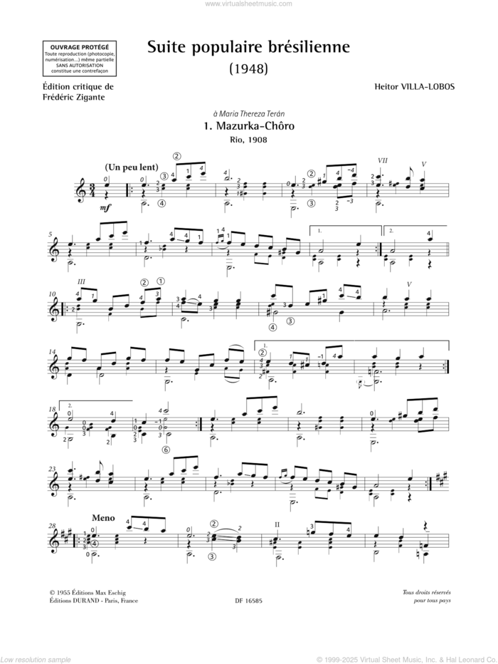This new feature (still experimental) allows you to ask questions related to this music title to our AI music assistant (powered by OpenAI ChatGPT), trained to answer as an expert on this music title.You may ask questions like "When was this piece written?" or "How would you suggest approaching this piece?" You can also ask questions about the author or anything else you may think of. Just enter your queries inside the field on the top of the displayed music and click the "Ask" button on the left to start chatting. Remember that the assistant cannot perform catalog searches. It is focused only on this music title. It could also give you wrong or imperfect answers. In that case, click the "regenerate" button on the side of the answer to replace it with a new one. And, of course, you can provide feedback for each answer so we can improve the system. ![]() Heitor Villa-Lobos: Mazurka-Choro for guitar solo, intermediate guitar sheet music. Includes an High-Quality PDF file to download instantly. Licensed to Virtual Sheet Music® by Hal Leonard® publishing company. NOTE: The image above is just a preview of the first page of this item. Buy this item to display, print, and enjoy the complete music. Basic Score Info