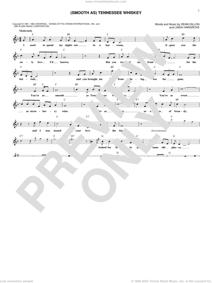 This new feature (still experimental) allows you to ask questions related to this music title to our AI music assistant (powered by OpenAI ChatGPT), trained to answer as an expert on this music title.You may ask questions like "When was this song written?" or "How would you suggest approaching this song?" You can also ask questions about the author or anything else you may think of. Just enter your queries inside the field on the top of the displayed music and click the "Ask" button on the left to start chatting. Remember that the assistant cannot perform catalog searches. It is focused only on this music title. It could also give you wrong or imperfect answers. In that case, click the "regenerate" button on the side of the answer to replace it with a new one. And, of course, you can provide feedback for each answer so we can improve the system. ![]() Chris Stapleton: Tennessee Whiskey for voice and other instruments (fake book), intermediate voice sheet music. High-Quality and Interactive, transposable in any key, play along. Includes an High-Quality PDF file to download instantly. Licensed to Virtual Sheet Music® by Hal Leonard® publishing company. NOTE: The sample above is just the first page preview of this item. Buy this item to display, print, and play the complete music. Basic Score Info