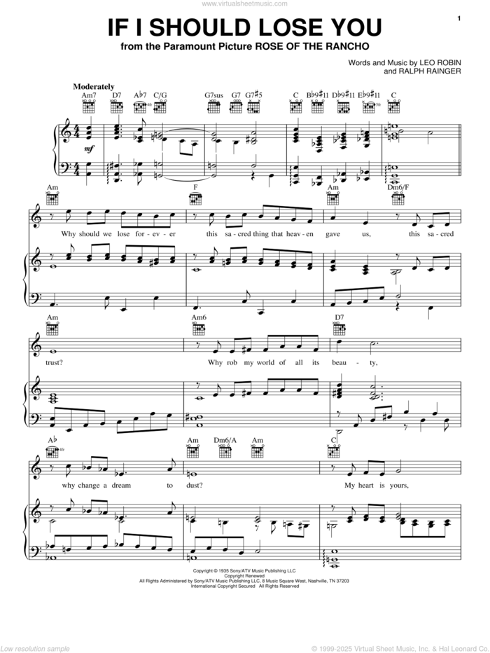 This new feature (still experimental) allows you to ask questions related to this music title to our AI music assistant (powered by OpenAI ChatGPT), trained to answer as an expert on this music title.You may ask questions like "When was this song written?" or "How would you suggest approaching this song?" You can also ask questions about the author or anything else you may think of. Just enter your queries inside the field on the top of the displayed music and click the "Ask" button on the left to start chatting. Remember that the assistant cannot perform catalog searches. It is focused only on this music title. It could also give you wrong or imperfect answers. In that case, click the "regenerate" button on the side of the answer to replace it with a new one. And, of course, you can provide feedback for each answer so we can improve the system. ![]() Ralph Rainger: If I Should Lose You for voice, piano or guitar, intermediate sheet music. High-Quality and Interactive, transposable in any key, play along. Includes an High-Quality PDF file to download instantly. Licensed to Virtual Sheet Music® by Hal Leonard® publishing company. NOTE: The sample above is just the first page preview of this item. Buy this item to display, print, and play the complete music. Basic Score Info