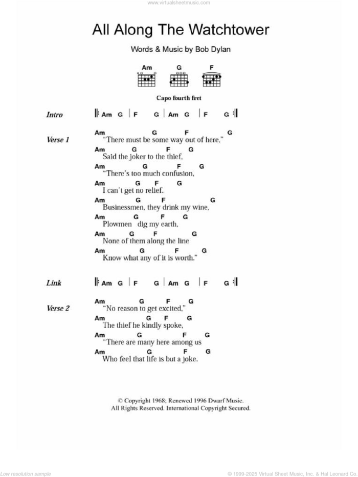 Bob Dylan: All Along The Watchtower for guitar (chords), intermediate sheet music. Includes an High-Quality PDF file to download instantly. Licensed to Virtual Sheet Music® by Hal Leonard® publishing company.