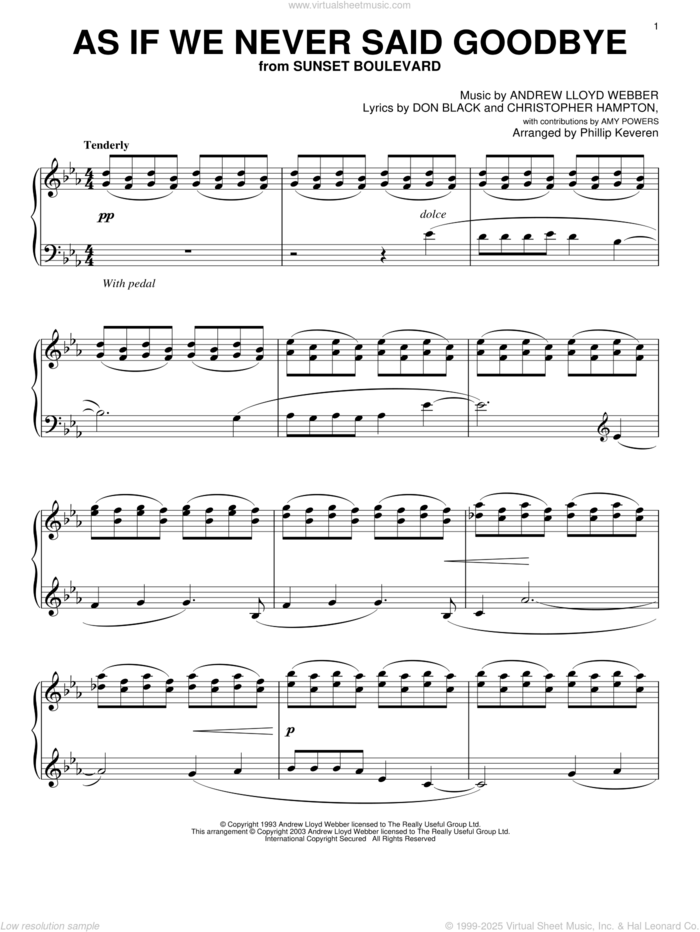 This new feature (still experimental) allows you to ask questions related to this music title to our AI music assistant (powered by OpenAI ChatGPT), trained to answer as an expert on this music title.You may ask questions like "When was this song written?" or "How would you suggest approaching this song?" You can also ask questions about the author or anything else you may think of. Just enter your queries inside the field on the top of the displayed music and click the "Ask" button on the left to start chatting. Remember that the assistant cannot perform catalog searches. It is focused only on this music title. It could also give you wrong or imperfect answers. In that case, click the "regenerate" button on the side of the answer to replace it with a new one. And, of course, you can provide feedback for each answer so we can improve the system. ![]() Andrew Lloyd Webber: As If We Never Said Goodbye (from Sunset Boulevard) (arr. Phillip Keveren) for piano solo, intermediate piano sheet music. High-Quality and Interactive, transposable in any key, play along. Includes an High-Quality PDF file to download instantly. Licensed to Virtual Sheet Music® by Hal Leonard® publishing company. NOTE: The sample above is just the first page preview of this item. Buy this item to display, print, and play the complete music. Basic Score Info