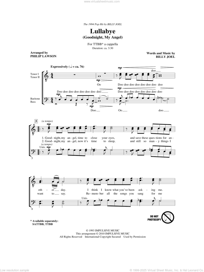 This new feature (still experimental) allows you to ask questions related to this music title to our AI music assistant (powered by OpenAI ChatGPT), trained to answer as an expert on this music title.You may ask questions like "When was this song written?" or "How would you suggest approaching this song?" You can also ask questions about the author or anything else you may think of. Just enter your queries inside the field on the top of the displayed music and click the "Ask" button on the left to start chatting. Remember that the assistant cannot perform catalog searches. It is focused only on this music title. It could also give you wrong or imperfect answers. In that case, click the "regenerate" button on the side of the answer to replace it with a new one. And, of course, you can provide feedback for each answer so we can improve the system. ![]() Billy Joel: Lullabye (Goodnight, My Angel) (arr. Philip Lawson) for choir (TTBB: tenor, bass), intermediate sheet music. High-Quality and Interactive, transposable in any key, play along. Includes an High-Quality PDF file to download instantly. Licensed to Virtual Sheet Music® by Hal Leonard® publishing company. NOTE: The sample above is just the first page preview of this item. Buy this item to display, print, and play the complete music. Basic Score Info