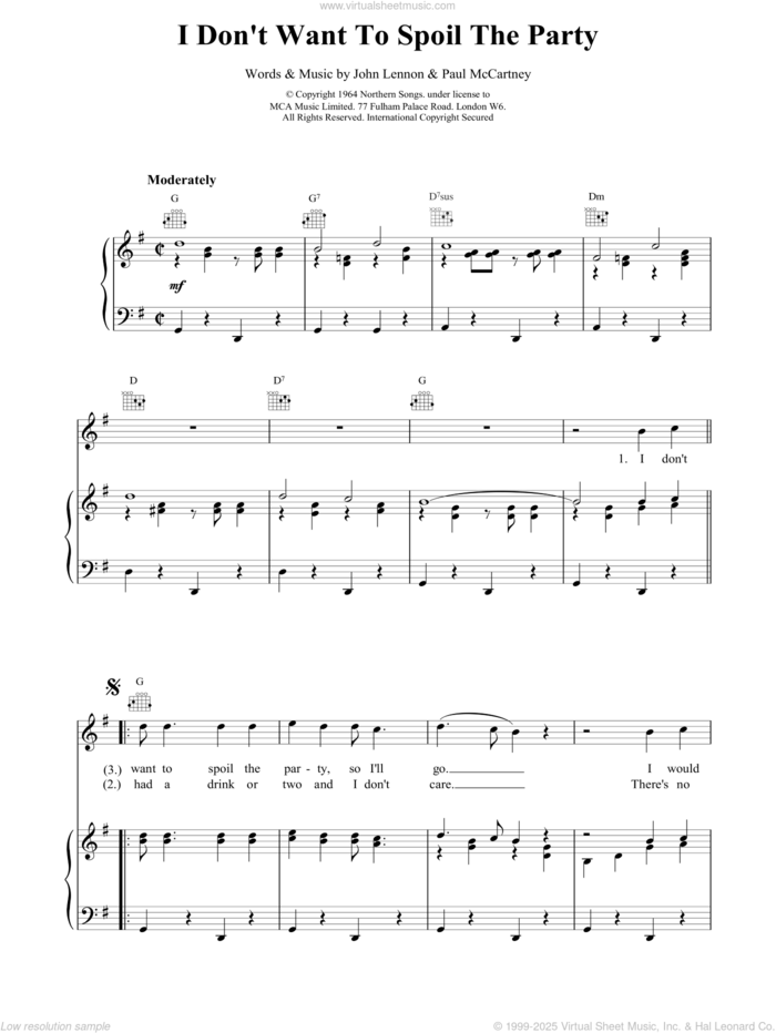 This new feature (still experimental) allows you to ask questions related to this music title to our AI music assistant (powered by OpenAI ChatGPT), trained to answer as an expert on this music title.You may ask questions like "When was this song written?" or "How would you suggest approaching this song?" You can also ask questions about the author or anything else you may think of. Just enter your queries inside the field on the top of the displayed music and click the "Ask" button on the left to start chatting. Remember that the assistant cannot perform catalog searches. It is focused only on this music title. It could also give you wrong or imperfect answers. In that case, click the "regenerate" button on the side of the answer to replace it with a new one. And, of course, you can provide feedback for each answer so we can improve the system. ![]() The Beatles: I Don't Want To Spoil The Party for voice, piano or guitar, intermediate sheet music. Includes an High-Quality PDF file to download instantly. Licensed to Virtual Sheet Music® by Hal Leonard® publishing company. NOTE: The image above is just a preview of the first page of this item. Buy this item to display, print, and enjoy the complete music. Basic Score Info