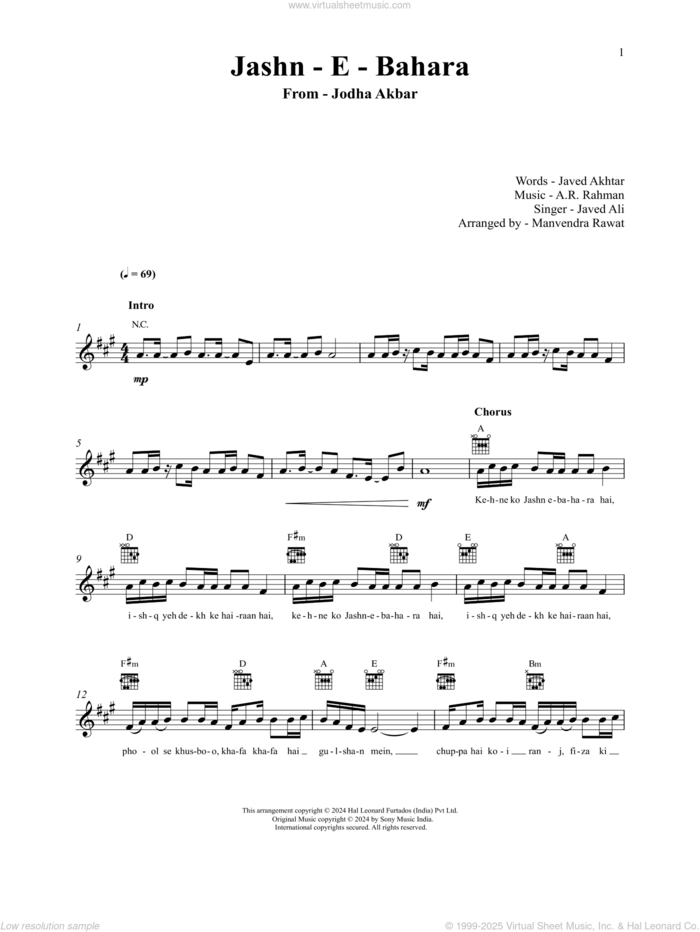 This new feature (still experimental) allows you to ask questions related to this music title to our AI music assistant (powered by OpenAI ChatGPT), trained to answer as an expert on this music title.You may ask questions like "When was this song written?" or "How would you suggest approaching this song?" You can also ask questions about the author or anything else you may think of. Just enter your queries inside the field on the top of the displayed music and click the "Ask" button on the left to start chatting. Remember that the assistant cannot perform catalog searches. It is focused only on this music title. It could also give you wrong or imperfect answers. In that case, click the "regenerate" button on the side of the answer to replace it with a new one. And, of course, you can provide feedback for each answer so we can improve the system. ![]() A.R. Rahman and Javed Ali: Jashn-E-Bahaaraa (from Jodhaa Akbar) for voice and other instruments (fake book), intermediate voice sheet music. High-Quality and Interactive, transposable in any key, play along. Includes an High-Quality PDF file to download instantly. Licensed to Virtual Sheet Music® by Hal Leonard® publishing company. NOTE: The sample above is just the first page preview of this item. Buy this item to display, print, and play the complete music. Basic Score Info