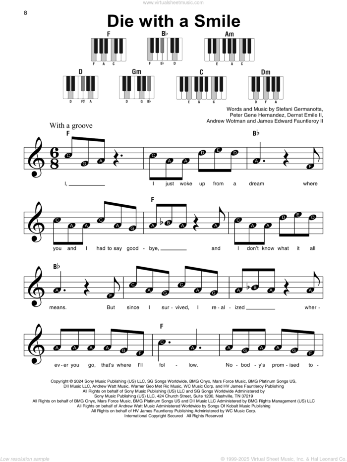 This new feature (still experimental) allows you to ask questions related to this music title to our AI music assistant (powered by OpenAI ChatGPT), trained to answer as an expert on this music title.You may ask questions like "When was this song written?" or "How would you suggest approaching this song?" You can also ask questions about the author or anything else you may think of. Just enter your queries inside the field on the top of the displayed music and click the "Ask" button on the left to start chatting. Remember that the assistant cannot perform catalog searches. It is focused only on this music title. It could also give you wrong or imperfect answers. In that case, click the "regenerate" button on the side of the answer to replace it with a new one. And, of course, you can provide feedback for each answer so we can improve the system. ![]() Bruno Mars & Lady Gaga: Die With A Smile, (beginner) for piano solo, beginner piano sheet music. Includes an High-Quality PDF file to download instantly. Licensed to Virtual Sheet Music® by Hal Leonard® publishing company. NOTE: The image above is just a preview of the first page of this item. Buy this item to display, print, and enjoy the complete music. Basic Score Info
