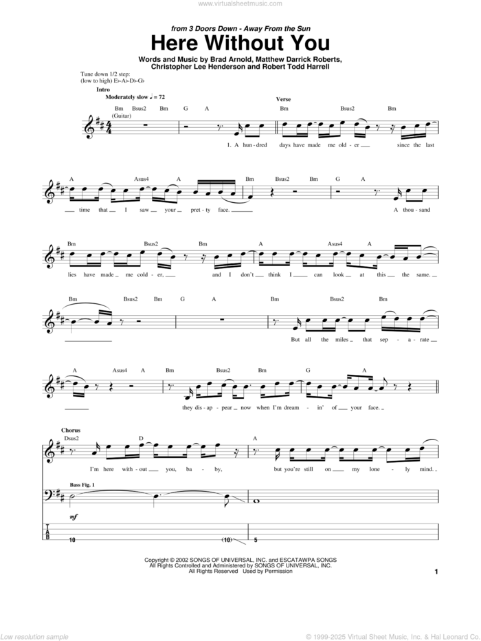 This new feature (still experimental) allows you to ask questions related to this music title to our AI music assistant (powered by OpenAI ChatGPT), trained to answer as an expert on this music title.You may ask questions like "When was this song written?" or "How would you suggest approaching this song?" You can also ask questions about the author or anything else you may think of. Just enter your queries inside the field on the top of the displayed music and click the "Ask" button on the left to start chatting. Remember that the assistant cannot perform catalog searches. It is focused only on this music title. It could also give you wrong or imperfect answers. In that case, click the "regenerate" button on the side of the answer to replace it with a new one. And, of course, you can provide feedback for each answer so we can improve the system. ![]() 3 Doors Down: Here Without You for bass (tablature) (bass guitar), intermediate sheet music. Includes an High-Quality PDF file to download instantly. Licensed to Virtual Sheet Music® by Hal Leonard® publishing company. NOTE: The image above is just a preview of the first page of this item. Buy this item to display, print, and enjoy the complete music. Basic Score Info