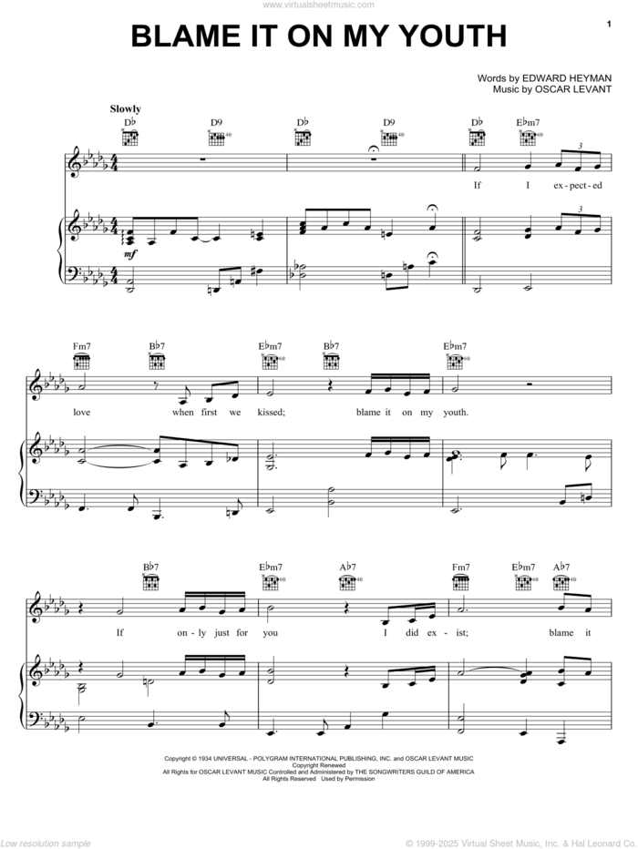 This new feature (still experimental) allows you to ask questions related to this music title to our AI music assistant (powered by OpenAI ChatGPT), trained to answer as an expert on this music title.You may ask questions like "When was this song written?" or "How would you suggest approaching this song?" You can also ask questions about the author or anything else you may think of. Just enter your queries inside the field on the top of the displayed music and click the "Ask" button on the left to start chatting. Remember that the assistant cannot perform catalog searches. It is focused only on this music title. It could also give you wrong or imperfect answers. In that case, click the "regenerate" button on the side of the answer to replace it with a new one. And, of course, you can provide feedback for each answer so we can improve the system. ![]() Jamie Cullum: Blame It On My Youth for voice, piano or guitar, intermediate sheet music. High-Quality and Interactive, transposable in any key, play along. Includes an High-Quality PDF file to download instantly. Licensed to Virtual Sheet Music® by Hal Leonard® publishing company. NOTE: The sample above is just the first page preview of this item. Buy this item to display, print, and play the complete music. Basic Score Info