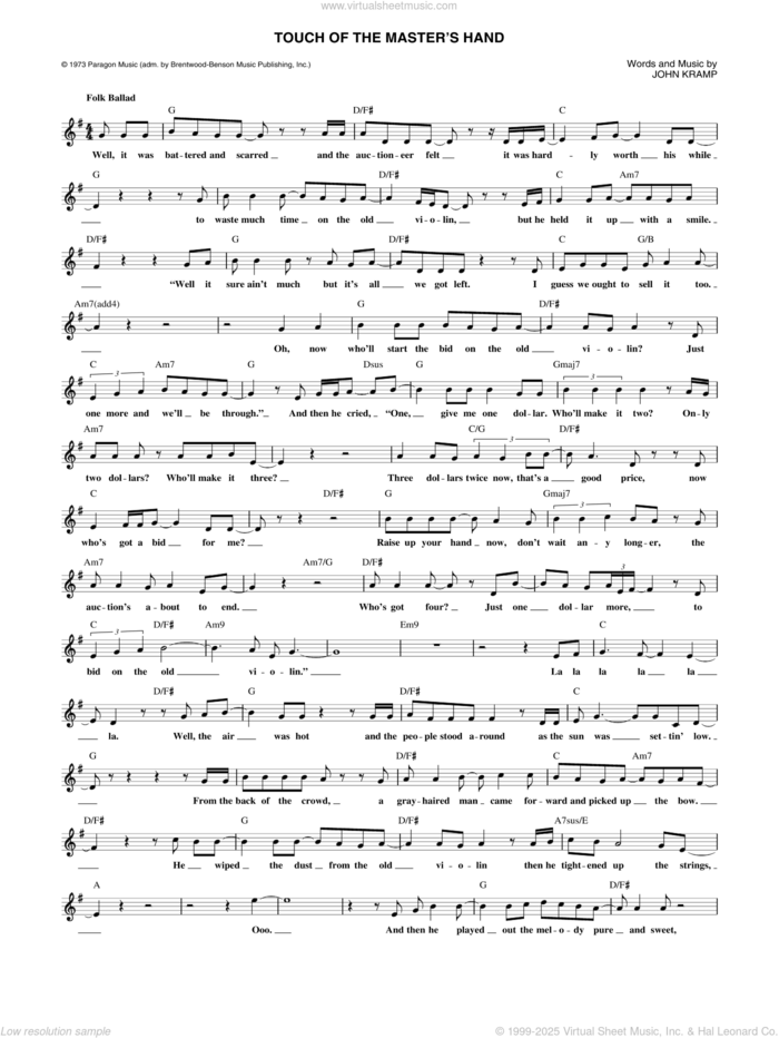 This new feature (still experimental) allows you to ask questions related to this music title to our AI music assistant (powered by OpenAI ChatGPT), trained to answer as an expert on this music title.You may ask questions like "When was this song written?" or "How would you suggest approaching this song?" You can also ask questions about the author or anything else you may think of. Just enter your queries inside the field on the top of the displayed music and click the "Ask" button on the left to start chatting. Remember that the assistant cannot perform catalog searches. It is focused only on this music title. It could also give you wrong or imperfect answers. In that case, click the "regenerate" button on the side of the answer to replace it with a new one. And, of course, you can provide feedback for each answer so we can improve the system. ![]() John Kramp: The Touch Of The Master's Hand for voice and other instruments (fake book), intermediate voice sheet music. Includes an High-Quality PDF file to download instantly. Licensed to Virtual Sheet Music® by Hal Leonard® publishing company. NOTE: The image above is just a preview of the first page of this item. Buy this item to display, print, and enjoy the complete music. Basic Score Info