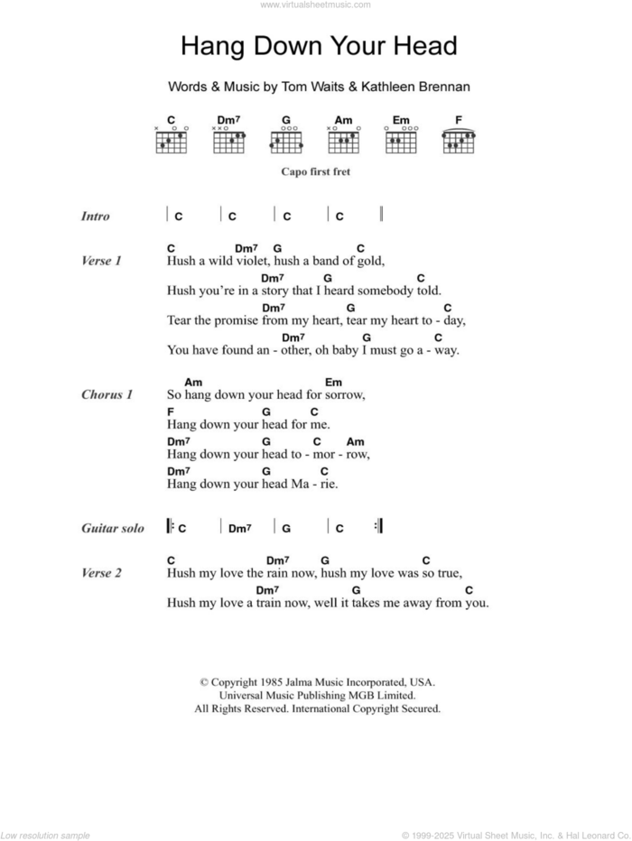 This new feature (still experimental) allows you to ask questions related to this music title to our AI music assistant (powered by OpenAI ChatGPT), trained to answer as an expert on this music title.You may ask questions like "When was this song written?" or "How would you suggest approaching this song?" You can also ask questions about the author or anything else you may think of. Just enter your queries inside the field on the top of the displayed music and click the "Ask" button on the left to start chatting. Remember that the assistant cannot perform catalog searches. It is focused only on this music title. It could also give you wrong or imperfect answers. In that case, click the "regenerate" button on the side of the answer to replace it with a new one. And, of course, you can provide feedback for each answer so we can improve the system. ![]() Tom Waits: Hang Down Your Head for guitar (chords), intermediate sheet music. Includes an High-Quality PDF file to download instantly. Licensed to Virtual Sheet Music® by Hal Leonard® publishing company. NOTE: The image above is just a preview of the first page of this item. Buy this item to display, print, and enjoy the complete music. Basic Score Info