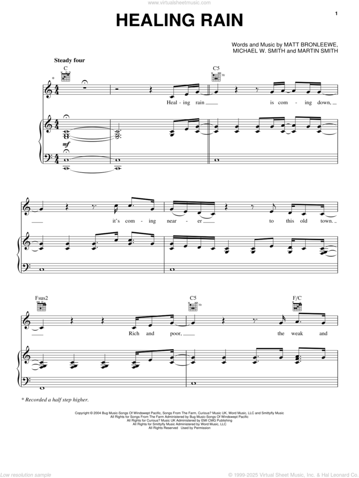 This new feature (still experimental) allows you to ask questions related to this music title to our AI music assistant (powered by OpenAI ChatGPT), trained to answer as an expert on this music title.You may ask questions like "When was this song written?" or "How would you suggest approaching this song?" You can also ask questions about the author or anything else you may think of. Just enter your queries inside the field on the top of the displayed music and click the "Ask" button on the left to start chatting. Remember that the assistant cannot perform catalog searches. It is focused only on this music title. It could also give you wrong or imperfect answers. In that case, click the "regenerate" button on the side of the answer to replace it with a new one. And, of course, you can provide feedback for each answer so we can improve the system. ![]() Michael W. Smith: Healing Rain for voice, piano or guitar, intermediate sheet music. High-Quality and Interactive, transposable in any key, play along. Includes an High-Quality PDF file to download instantly. Licensed to Virtual Sheet Music® by Hal Leonard® publishing company. NOTE: The sample above is just the first page preview of this item. Buy this item to display, print, and play the complete music. Basic Score Info