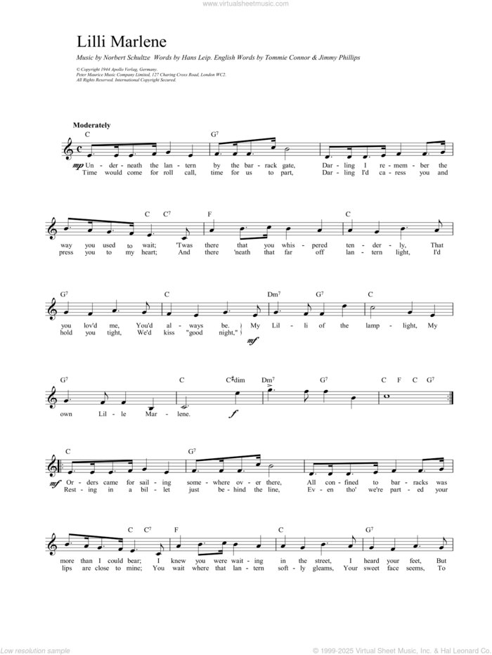 This new feature (still experimental) allows you to ask questions related to this music title to our AI music assistant (powered by OpenAI ChatGPT), trained to answer as an expert on this music title.You may ask questions like "When was this song written?" or "How would you suggest approaching this song?" You can also ask questions about the author or anything else you may think of. Just enter your queries inside the field on the top of the displayed music and click the "Ask" button on the left to start chatting. Remember that the assistant cannot perform catalog searches. It is focused only on this music title. It could also give you wrong or imperfect answers. In that case, click the "regenerate" button on the side of the answer to replace it with a new one. And, of course, you can provide feedback for each answer so we can improve the system. ![]() Norbert Schultze: Lili Marlene for voice and other instruments (fake book), intermediate voice sheet music. Includes an High-Quality PDF file to download instantly. Licensed to Virtual Sheet Music® by Hal Leonard® publishing company. NOTE: The image above is just a preview of the first page of this item. Buy this item to display, print, and enjoy the complete music. Basic Score Info