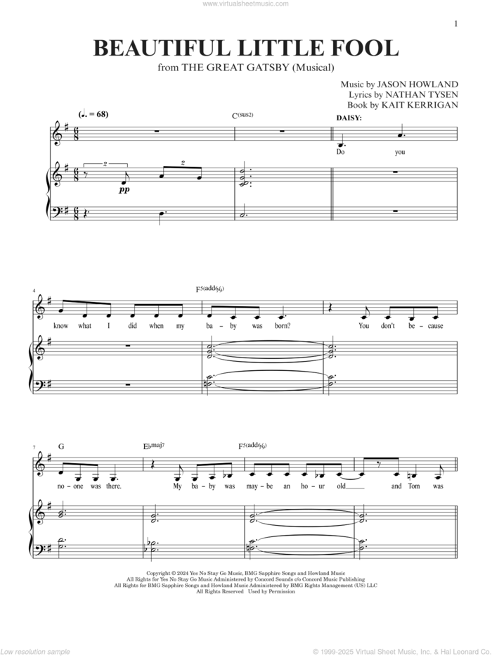 This new feature (still experimental) allows you to ask questions related to this music title to our AI music assistant (powered by OpenAI ChatGPT), trained to answer as an expert on this music title.You may ask questions like "When was this song written?" or "How would you suggest approaching this song?" You can also ask questions about the author or anything else you may think of. Just enter your queries inside the field on the top of the displayed music and click the "Ask" button on the left to start chatting. Remember that the assistant cannot perform catalog searches. It is focused only on this music title. It could also give you wrong or imperfect answers. In that case, click the "regenerate" button on the side of the answer to replace it with a new one. And, of course, you can provide feedback for each answer so we can improve the system. ![]() Jason Howland: Beautiful Little Fool (from The Great Gatsby) for voice and piano, intermediate voice sheet music. Includes an High-Quality PDF file to download instantly. Licensed to Virtual Sheet Music® by Hal Leonard® publishing company. NOTE: The image above is just a preview of the first page of this item. Buy this item to display, print, and enjoy the complete music. Basic Score Info