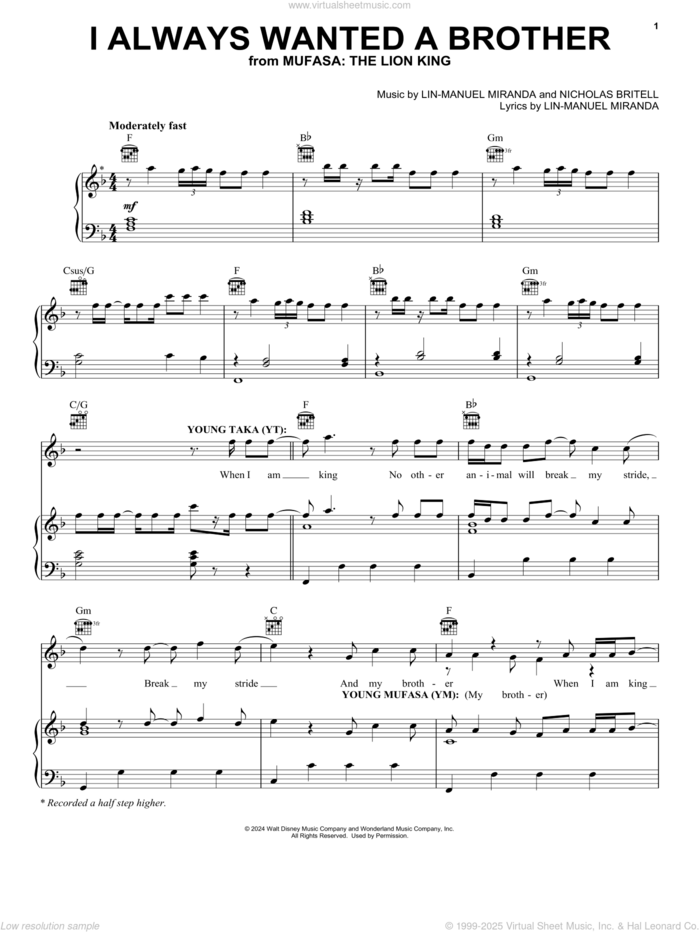 This new feature (still experimental) allows you to ask questions related to this music title to our AI music assistant (powered by OpenAI ChatGPT), trained to answer as an expert on this music title.You may ask questions like "When was this song written?" or "How would you suggest approaching this song?" You can also ask questions about the author or anything else you may think of. Just enter your queries inside the field on the top of the displayed music and click the "Ask" button on the left to start chatting. Remember that the assistant cannot perform catalog searches. It is focused only on this music title. It could also give you wrong or imperfect answers. In that case, click the "regenerate" button on the side of the answer to replace it with a new one. And, of course, you can provide feedback for each answer so we can improve the system. ![]() Lin-Manuel Miranda: I Always Wanted A Brother (from Mufasa: The Lion King) for voice, piano or guitar, intermediate sheet music. High-Quality and Interactive, transposable in any key, play along. Includes an High-Quality PDF file to download instantly. Licensed to Virtual Sheet Music® by Hal Leonard® publishing company. NOTE: The sample above is just the first page preview of this item. Buy this item to display, print, and play the complete music. Basic Score Info