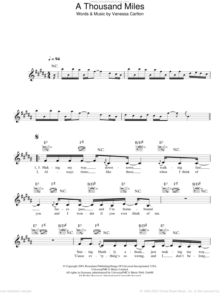 This new feature (still experimental) allows you to ask questions related to this music title to our AI music assistant (powered by OpenAI ChatGPT), trained to answer as an expert on this music title.You may ask questions like "When was this song written?" or "How would you suggest approaching this song?" You can also ask questions about the author or anything else you may think of. Just enter your queries inside the field on the top of the displayed music and click the "Ask" button on the left to start chatting. Remember that the assistant cannot perform catalog searches. It is focused only on this music title. It could also give you wrong or imperfect answers. In that case, click the "regenerate" button on the side of the answer to replace it with a new one. And, of course, you can provide feedback for each answer so we can improve the system. ![]() Vanessa Carlton: A Thousand Miles for voice and other instruments (fake book), intermediate voice sheet music. Includes an High-Quality PDF file to download instantly. Licensed to Virtual Sheet Music® by Hal Leonard® publishing company. NOTE: The image above is just a preview of the first page of this item. Buy this item to display, print, and enjoy the complete music. Basic Score Info