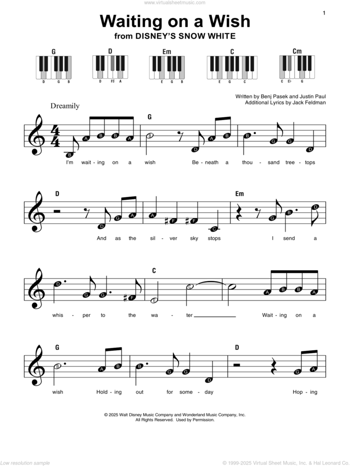 This new feature (still experimental) allows you to ask questions related to this music title to our AI music assistant (powered by OpenAI ChatGPT), trained to answer as an expert on this music title.You may ask questions like "When was this song written?" or "How would you suggest approaching this song?" You can also ask questions about the author or anything else you may think of. Just enter your queries inside the field on the top of the displayed music and click the "Ask" button on the left to start chatting. Remember that the assistant cannot perform catalog searches. It is focused only on this music title. It could also give you wrong or imperfect answers. In that case, click the "regenerate" button on the side of the answer to replace it with a new one. And, of course, you can provide feedback for each answer so we can improve the system. ![]() Rachel Zegler: Waiting On A Wish (from Snow White) (2025) for piano solo, beginner piano sheet music. Includes an High-Quality PDF file to download instantly. Licensed to Virtual Sheet Music® by Hal Leonard® publishing company. NOTE: The image above is just a preview of the first page of this item. Buy this item to display, print, and enjoy the complete music. Basic Score Info