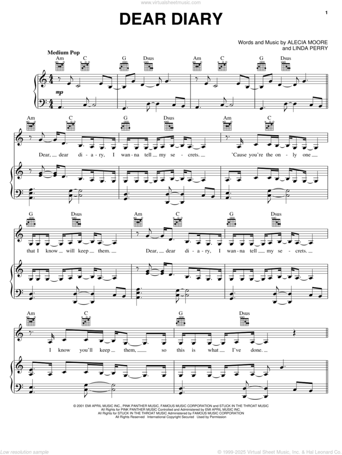 This new feature (still experimental) allows you to ask questions related to this music title to our AI music assistant (powered by OpenAI ChatGPT), trained to answer as an expert on this music title.You may ask questions like "When was this song written?" or "How would you suggest approaching this song?" You can also ask questions about the author or anything else you may think of. Just enter your queries inside the field on the top of the displayed music and click the "Ask" button on the left to start chatting. Remember that the assistant cannot perform catalog searches. It is focused only on this music title. It could also give you wrong or imperfect answers. In that case, click the "regenerate" button on the side of the answer to replace it with a new one. And, of course, you can provide feedback for each answer so we can improve the system. ![]() Dear Diary for voice, piano or guitar, intermediate sheet music. High-Quality and Interactive, transposable in any key, play along. Includes an High-Quality PDF file to download instantly. Licensed to Virtual Sheet Music® by Hal Leonard® publishing company. NOTE: The sample above is just the first page preview of this item. Buy this item to display, print, and play the complete music. Basic Score Info