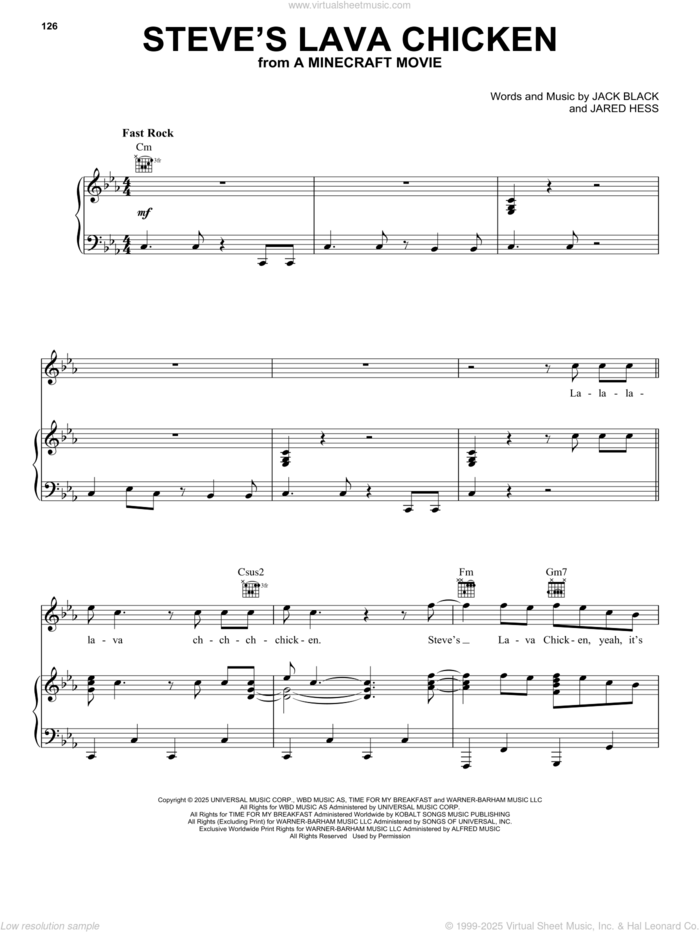 This new feature (still experimental) allows you to ask questions related to this music title to our AI music assistant (powered by OpenAI ChatGPT), trained to answer as an expert on this music title.You may ask questions like "When was this song written?" or "How would you suggest approaching this song?" You can also ask questions about the author or anything else you may think of. Just enter your queries inside the field on the top of the displayed music and click the "Ask" button on the left to start chatting. Remember that the assistant cannot perform catalog searches. It is focused only on this music title. It could also give you wrong or imperfect answers. In that case, click the "regenerate" button on the side of the answer to replace it with a new one. And, of course, you can provide feedback for each answer so we can improve the system. ![]() Jack Black: Steve's Lava Chicken (from A Minecraft Movie) for voice, piano or guitar, intermediate sheet music. High-Quality and Interactive, transposable in any key, play along. Includes an High-Quality PDF file to download instantly. Licensed to Virtual Sheet Music® by Hal Leonard® publishing company. NOTE: The sample above is just the first page preview of this item. Buy this item to display, print, and play the complete music. Basic Score Info