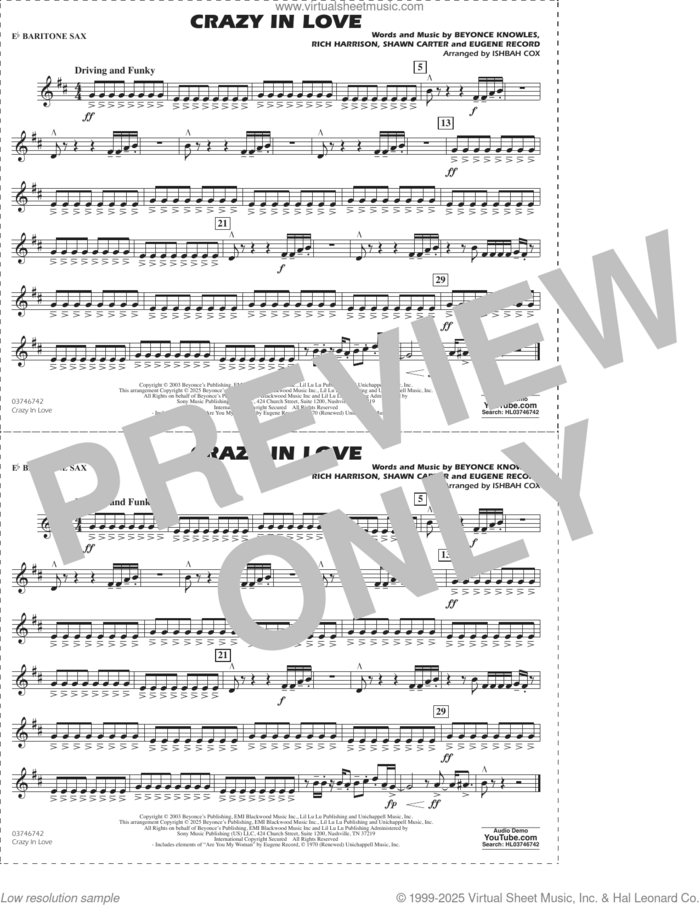 This new feature (still experimental) allows you to ask questions related to this music title to our AI music assistant (powered by OpenAI ChatGPT), trained to answer as an expert on this music title.You may ask questions like "When was this song written?" or "How would you suggest approaching this song?" You can also ask questions about the author or anything else you may think of. Just enter your queries inside the field on the top of the displayed music and click the "Ask" button on the left to start chatting. Remember that the assistant cannot perform catalog searches. It is focused only on this music title. It could also give you wrong or imperfect answers. In that case, click the "regenerate" button on the side of the answer to replace it with a new one. And, of course, you can provide feedback for each answer so we can improve the system. ![]() Beyonce: Crazy in Love (arr. Ishbah Cox) for marching band (Eb baritone sax), intermediate sheet music. Includes an High-Quality PDF file to download instantly. Licensed to Virtual Sheet Music® by Hal Leonard® publishing company. NOTE: The image above is just a preview of the first page of this item. Buy this item to display, print, and enjoy the complete music. Basic Score Info
