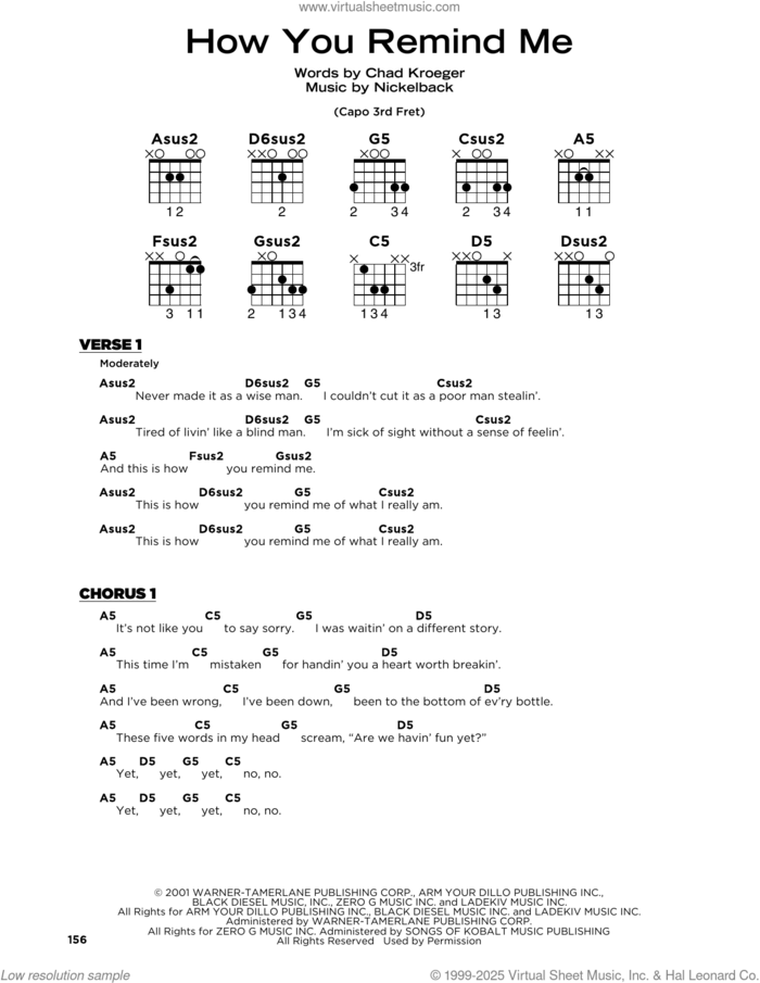 This new feature (still experimental) allows you to ask questions related to this music title to our AI music assistant (powered by OpenAI ChatGPT), trained to answer as an expert on this music title.You may ask questions like "When was this song written?" or "How would you suggest approaching this song?" You can also ask questions about the author or anything else you may think of. Just enter your queries inside the field on the top of the displayed music and click the "Ask" button on the left to start chatting. Remember that the assistant cannot perform catalog searches. It is focused only on this music title. It could also give you wrong or imperfect answers. In that case, click the "regenerate" button on the side of the answer to replace it with a new one. And, of course, you can provide feedback for each answer so we can improve the system. ![]() Nickelback: How You Remind Me for guitar solo, beginner guitar sheet music. Includes an High-Quality PDF file to download instantly. Licensed to Virtual Sheet Music® by Hal Leonard® publishing company. NOTE: The image above is just a preview of the first page of this item. Buy this item to display, print, and enjoy the complete music. Basic Score Info