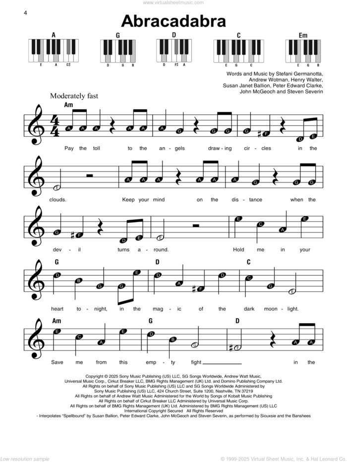 This new feature (still experimental) allows you to ask questions related to this music title to our AI music assistant (powered by OpenAI ChatGPT), trained to answer as an expert on this music title.You may ask questions like "When was this song written?" or "How would you suggest approaching this song?" You can also ask questions about the author or anything else you may think of. Just enter your queries inside the field on the top of the displayed music and click the "Ask" button on the left to start chatting. Remember that the assistant cannot perform catalog searches. It is focused only on this music title. It could also give you wrong or imperfect answers. In that case, click the "regenerate" button on the side of the answer to replace it with a new one. And, of course, you can provide feedback for each answer so we can improve the system. ![]() Lady Gaga: Abracadabra for piano solo, beginner piano sheet music. Includes an High-Quality PDF file to download instantly. Licensed to Virtual Sheet Music® by Hal Leonard® publishing company. NOTE: The image above is just a preview of the first page of this item. Buy this item to display, print, and enjoy the complete music. Basic Score Info