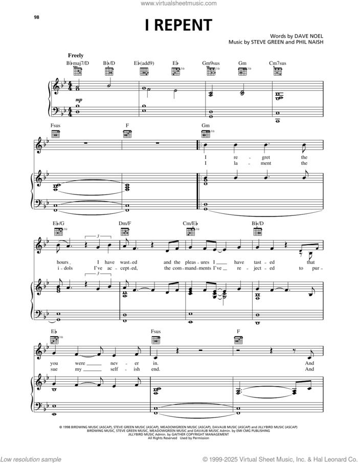 This new feature (still experimental) allows you to ask questions related to this music title to our AI music assistant (powered by OpenAI ChatGPT), trained to answer as an expert on this music title.You may ask questions like "When was this song written?" or "How would you suggest approaching this song?" You can also ask questions about the author or anything else you may think of. Just enter your queries inside the field on the top of the displayed music and click the "Ask" button on the left to start chatting. Remember that the assistant cannot perform catalog searches. It is focused only on this music title. It could also give you wrong or imperfect answers. In that case, click the "regenerate" button on the side of the answer to replace it with a new one. And, of course, you can provide feedback for each answer so we can improve the system. ![]() Steve Green: I Repent for voice, piano or guitar, intermediate sheet music. Includes an High-Quality PDF file to download instantly. Licensed to Virtual Sheet Music® by Hal Leonard® publishing company. NOTE: The image above is just a preview of the first page of this item. Buy this item to display, print, and enjoy the complete music. Basic Score Info