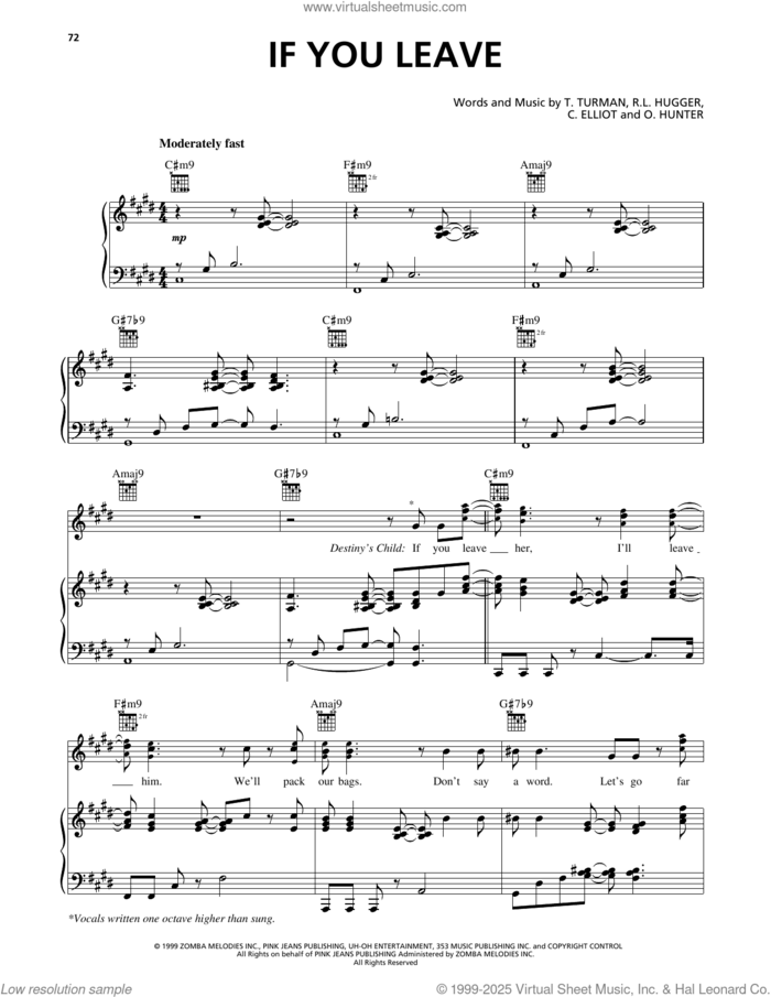 This new feature (still experimental) allows you to ask questions related to this music title to our AI music assistant (powered by OpenAI ChatGPT), trained to answer as an expert on this music title.You may ask questions like "When was this song written?" or "How would you suggest approaching this song?" You can also ask questions about the author or anything else you may think of. Just enter your queries inside the field on the top of the displayed music and click the "Ask" button on the left to start chatting. Remember that the assistant cannot perform catalog searches. It is focused only on this music title. It could also give you wrong or imperfect answers. In that case, click the "regenerate" button on the side of the answer to replace it with a new one. And, of course, you can provide feedback for each answer so we can improve the system. ![]() Destiny's Child: If You Leave (feat. Next) for voice, piano or guitar, intermediate sheet music. Includes an High-Quality PDF file to download instantly. Licensed to Virtual Sheet Music® by Hal Leonard® publishing company. NOTE: The image above is just a preview of the first page of this item. Buy this item to display, print, and enjoy the complete music. Basic Score Info