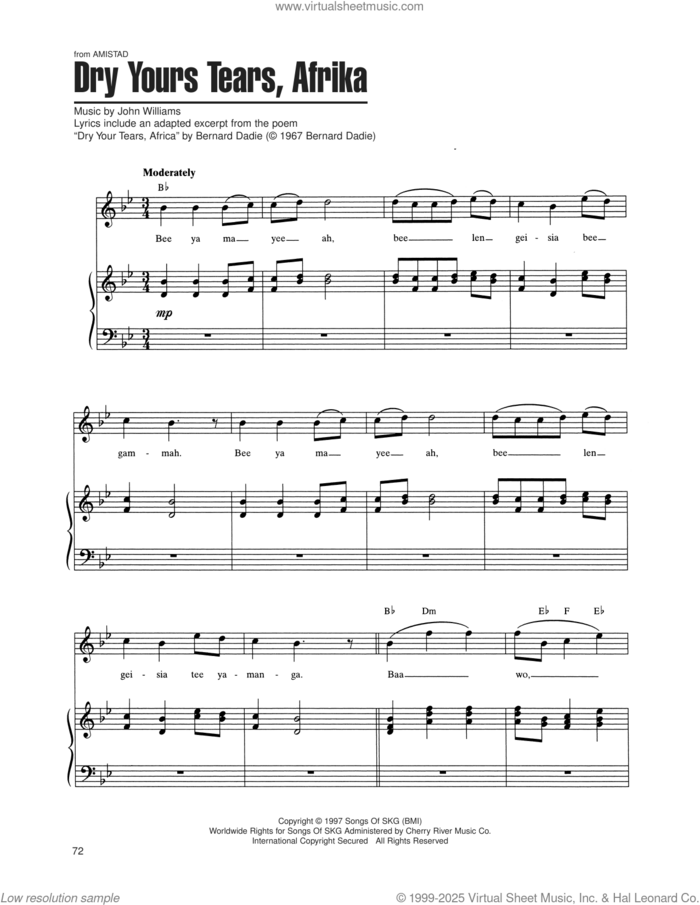 This new feature (still experimental) allows you to ask questions related to this music title to our AI music assistant (powered by OpenAI ChatGPT), trained to answer as an expert on this music title.You may ask questions like "When was this song written?" or "How would you suggest approaching this song?" You can also ask questions about the author or anything else you may think of. Just enter your queries inside the field on the top of the displayed music and click the "Ask" button on the left to start chatting. Remember that the assistant cannot perform catalog searches. It is focused only on this music title. It could also give you wrong or imperfect answers. In that case, click the "regenerate" button on the side of the answer to replace it with a new one. And, of course, you can provide feedback for each answer so we can improve the system. ![]() John Williams: Dry Your Tears, Afrika (from Amistad) for voice, piano or guitar, intermediate sheet music. Includes an High-Quality PDF file to download instantly. Licensed to Virtual Sheet Music® by Hal Leonard® publishing company. NOTE: The image above is just a preview of the first page of this item. Buy this item to display, print, and enjoy the complete music. Basic Score Info