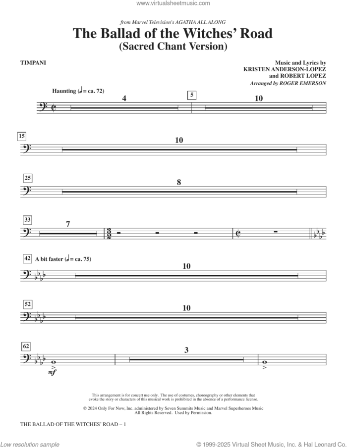 This new feature (still experimental) allows you to ask questions related to this music title to our AI music assistant (powered by OpenAI ChatGPT), trained to answer as an expert on this music title.You may ask questions like "When was this song written?" or "How would you suggest approaching this song?" You can also ask questions about the author or anything else you may think of. Just enter your queries inside the field on the top of the displayed music and click the "Ask" button on the left to start chatting. Remember that the assistant cannot perform catalog searches. It is focused only on this music title. It could also give you wrong or imperfect answers. In that case, click the "regenerate" button on the side of the answer to replace it with a new one. And, of course, you can provide feedback for each answer so we can improve the system. ![]() Robert Lopez: The Ballad Of The Witches' Road (from Agatha All Along) for orchestra/band (timpani), intermediate sheet music. Includes an High-Quality PDF file to download instantly. Licensed to Virtual Sheet Music® by Hal Leonard® publishing company. NOTE: The image above is just a preview of the first page of this item. Buy this item to display, print, and enjoy the complete music. Basic Score Info